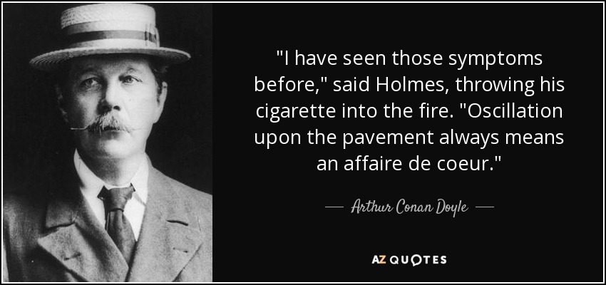 "I have seen those symptoms before," said Holmes, throwing his cigarette into the fire. "Oscillation upon the pavement always means an affaire de coeur."
