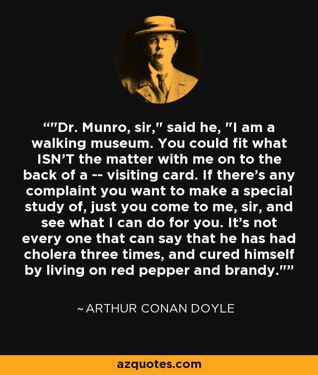 "Dr. Munro, sir," said he, "I am a walking museum. You could fit what ISN'T the matter with me on to the back of a -- visiting card. If there's any complaint you want to make a special study of, just you come to me, sir, and see what I can do for you. It's not every one that can say that he has had cholera three times, and cured himself by living on red pepper and brandy."
