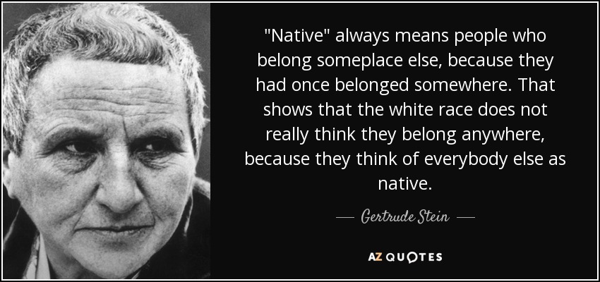 "Native" always means people who belong someplace else, because they had once belonged somewhere. That shows that the white race does not really think they belong anywhere, because they think of everybody else as native.