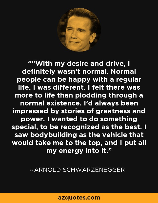 "With my desire and drive, I definitely wasn't normal. Normal people can be happy with a regular life. I was different. I felt there was more to life than plodding through a normal existence. I'd always been impressed by stories of greatness and power. I wanted to do something special, to be recognized as the best. I saw bodybuilding as the vehicle that would take me to the top, and I put all my energy into it.