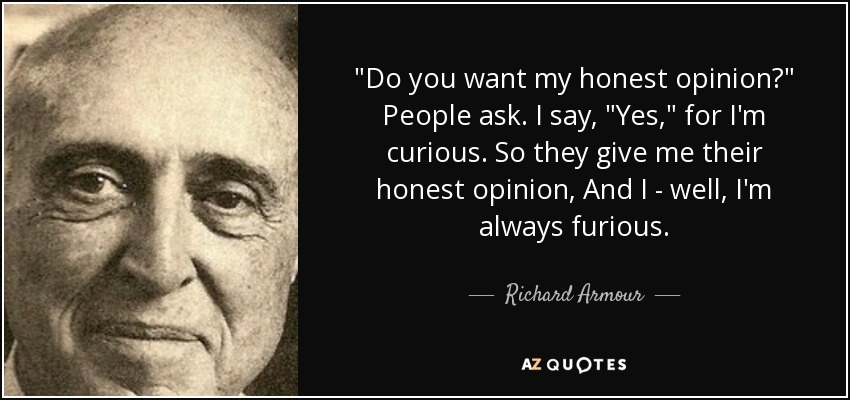 "Do you want my honest opinion?" People ask. I say, "Yes," for I'm curious. So they give me their honest opinion, And I - well, I'm always furious.