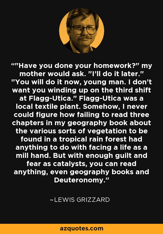 "Have you done your homework?" my mother would ask. "I'll do it later." "You will do it now, young man. I don't want you winding up on the third shift at Flagg-Utica." Flagg-Utica was a local textile plant. Somehow, I never could figure how failing to read three chapters in my geography book about the various sorts of vegetation to be found in a tropical rain forest had anything to do with facing a life as a mill hand. But with enough guilt and fear as catalysts, you can read anything, even geography books and Deuteronomy.