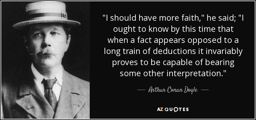 "I should have more faith," he said; "I ought to know by this time that when a fact appears opposed to a long train of deductions it invariably proves to be capable of bearing some other interpretation."