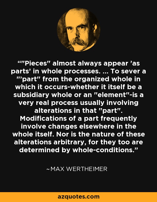 "Pieces" almost always appear 'as parts' in whole processes. ... To sever a "'part" from the organized whole in which it occurs-whether it itself be a subsidiary whole or an "element"-is a very real process usually involving alterations in that "part". Modifications of a part frequently involve changes elsewhere in the whole itself. Nor is the nature of these alterations arbitrary, for they too are determined by whole-conditions.