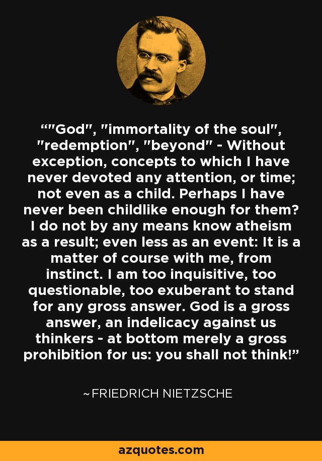 I do not by any means know atheism as a result; even less as an event: It is a matter of course with me, from instinct. I am too inquisitive, too questionable, too exuberant to stand for any gross answer. God is a gross answer, an indelicacy against us thinkers - at bottom merely a gross prohibition for us: you shall not think!