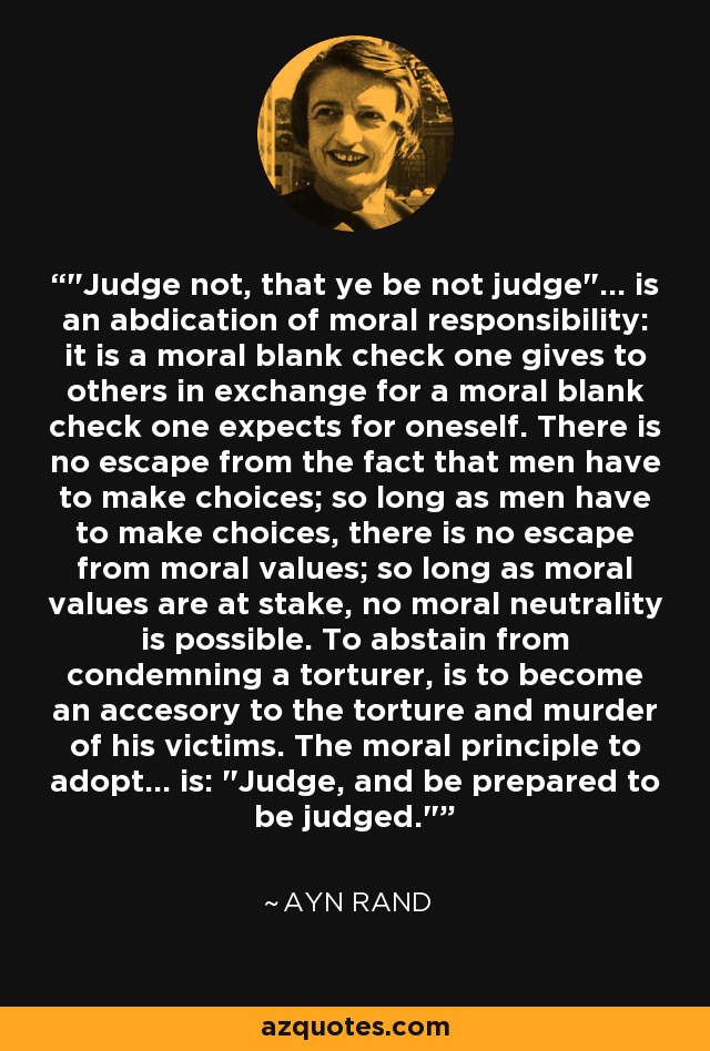 "Judge not, that ye be not judge"... is an abdication of moral responsibility: it is a moral blank check one gives to others in exchange for a moral blank check one expects for oneself. There is no escape from the fact that men have to make choices; so long as men have to make choices, there is no escape from moral values; so long as moral values are at stake, no moral neutrality is possible. To abstain from condemning a torturer, is to become an accesory to the torture and murder of his victims. The moral principle to adopt... is: "Judge, and be prepared to be judged."