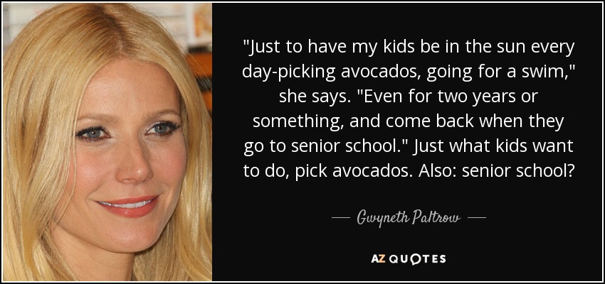 "Just to have my kids be in the sun every day-picking avocados, going for a swim," she says. "Even for two years or something, and come back when they go to senior school." Just what kids want to do, pick avocados. Also: senior school?