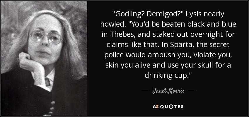 "Godling? Demigod?" Lysis nearly howled. "You'd be beaten black and blue in Thebes, and staked out overnight for claims like that. In Sparta, the secret police would ambush you, violate you, skin you alive and use your skull for a drinking cup."