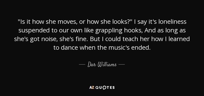 "Is it how she moves, or how she looks?" I say it's loneliness suspended to our own like grappling hooks, And as long as she's got noise, she's fine. But I could teach her how I learned to dance when the music's ended.