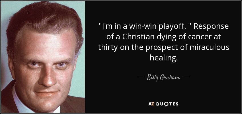 "I'm in a win-win playoff. " Response of a Christian dying of cancer at thirty on the prospect of miraculous healing.