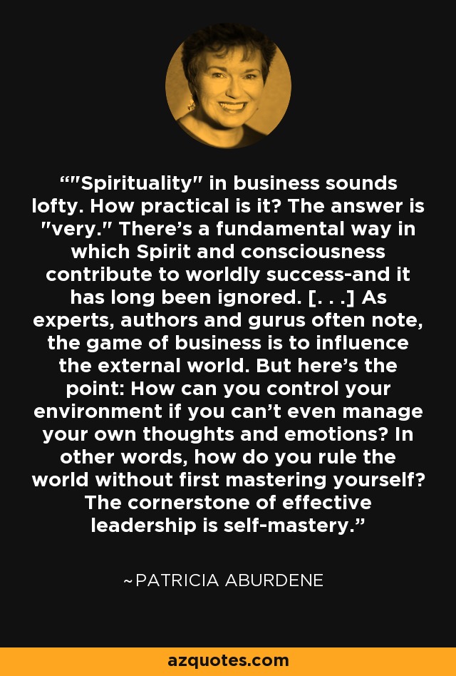 "Spirituality" in business sounds lofty. How practical is it? The answer is "very." There's a fundamental way in which Spirit and consciousness contribute to worldly success-and it has long been ignored. [. . .] As experts, authors and gurus often note, the game of business is to influence the external world. But here's the point: How can you control your environment if you can't even manage your own thoughts and emotions? In other words, how do you rule the world without first mastering yourself? The cornerstone of effective leadership is self-mastery.