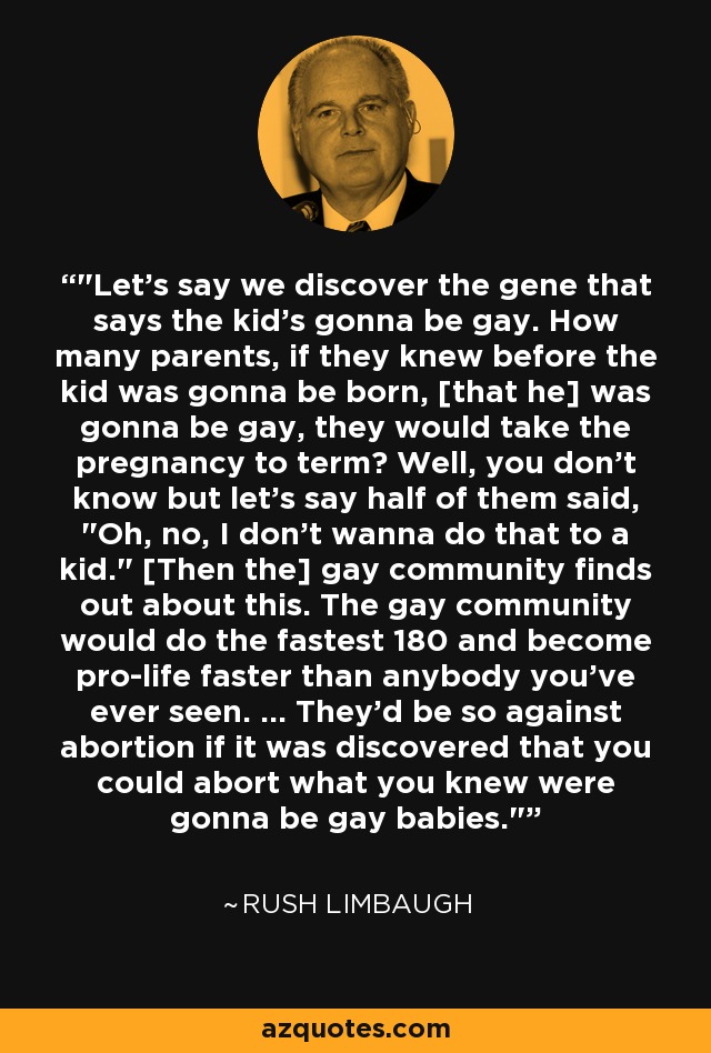"Let's say we discover the gene that says the kid's gonna be gay. How many parents, if they knew before the kid was gonna be born, [that he] was gonna be gay, they would take the pregnancy to term? Well, you don't know but let's say half of them said, "Oh, no, I don't wanna do that to a kid." [Then the] gay community finds out about this. The gay community would do the fastest 180 and become pro-life faster than anybody you've ever seen. ... They'd be so against abortion if it was discovered that you could abort what you knew were gonna be gay babies."