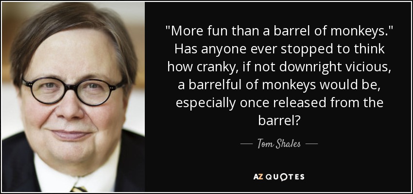 "More fun than a barrel of monkeys." Has anyone ever stopped to think how cranky, if not downright vicious, a barrelful of monkeys would be, especially once released from the barrel?