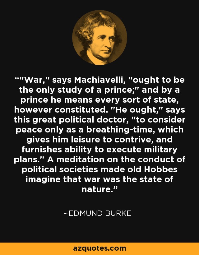 "War," says Machiavelli, "ought to be the only study of a prince;" and by a prince he means every sort of state, however constituted. "He ought," says this great political doctor, "to consider peace only as a breathing-time, which gives him leisure to contrive, and furnishes ability to execute military plans." A meditation on the conduct of political societies made old Hobbes imagine that war was the state of nature.