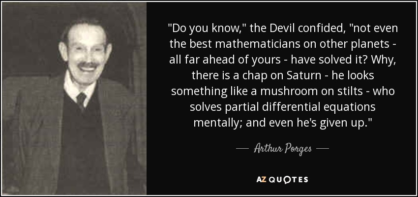 "Do you know," the Devil confided, "not even the best mathematicians on other planets - all far ahead of yours - have solved it? Why, there is a chap on Saturn - he looks something like a mushroom on stilts - who solves partial differential equations mentally; and even he's given up."