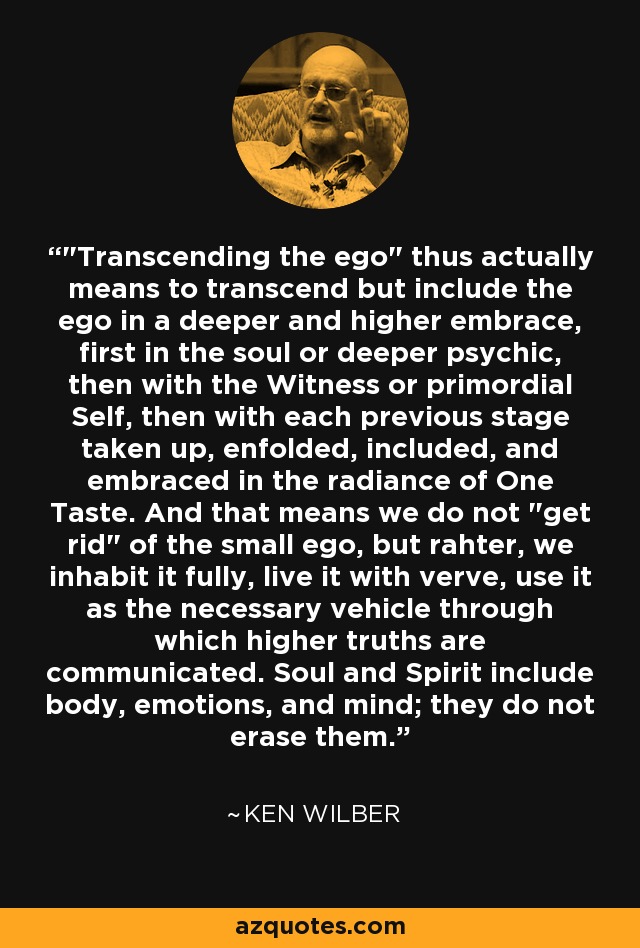 "Transcending the ego" thus actually means to transcend but include the ego in a deeper and higher embrace, first in the soul or deeper psychic, then with the Witness or primordial Self, then with each previous stage taken up, enfolded, included, and embraced in the radiance of One Taste. And that means we do not "get rid" of the small ego, but rahter, we inhabit it fully, live it with verve, use it as the necessary vehicle through which higher truths are communicated. Soul and Spirit include body, emotions, and mind; they do not erase them.