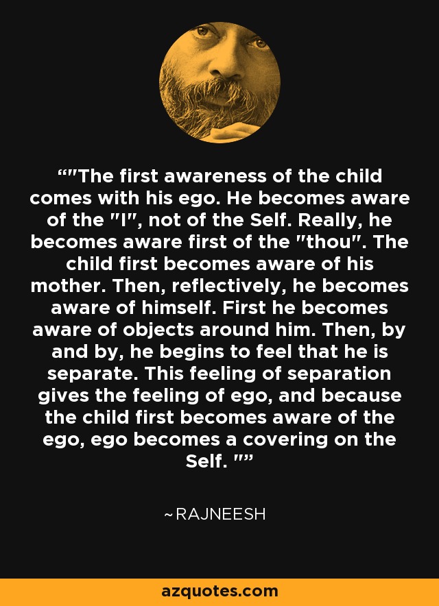 "The first awareness of the child comes with his ego. He becomes aware of the "I", not of the Self. Really, he becomes aware first of the "thou". The child first becomes aware of his mother. Then, reflectively, he becomes aware of himself. First he becomes aware of objects around him. Then, by and by, he begins to feel that he is separate. This feeling of separation gives the feeling of ego, and because the child first becomes aware of the ego, ego becomes a covering on the Self. "