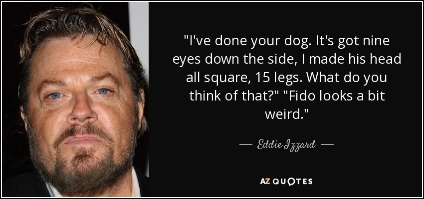"I've done your dog. It's got nine eyes down the side, I made his head all square, 15 legs. What do you think of that?" "Fido looks a bit weird."