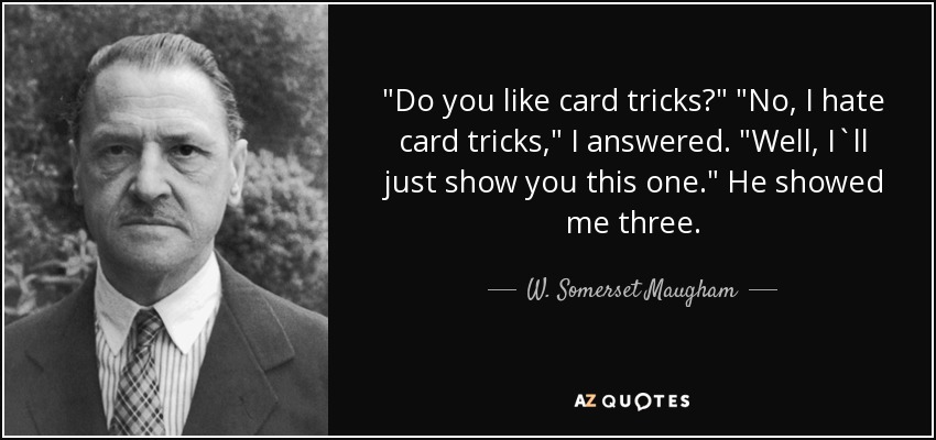 "Do you like card tricks?" "No, I hate card tricks," I answered. "Well, I`ll just show you this one." He showed me three.