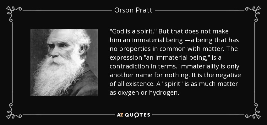 "God is a spirit." But that does not make him an immaterial being —a being that has no properties in common with matter. The expression "an immaterial being," is a contradiction in terms. Immateriality is only another name for nothing. It is the negative of all existence. A "spirit" is as much matter as oxygen or hydrogen.