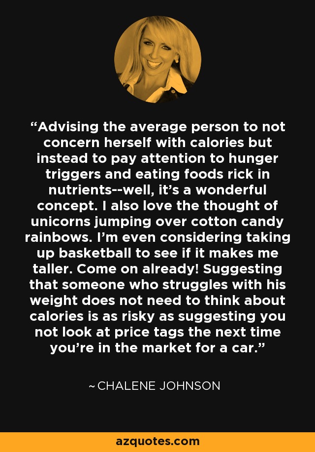 Advising the average person to not concern herself with calories but instead to pay attention to hunger triggers and eating foods rick in nutrients--well, it's a wonderful concept. I also love the thought of unicorns jumping over cotton candy rainbows. I'm even considering taking up basketball to see if it makes me taller. Come on already! Suggesting that someone who struggles with his weight does not need to think about calories is as risky as suggesting you not look at price tags the next time you're in the market for a car.