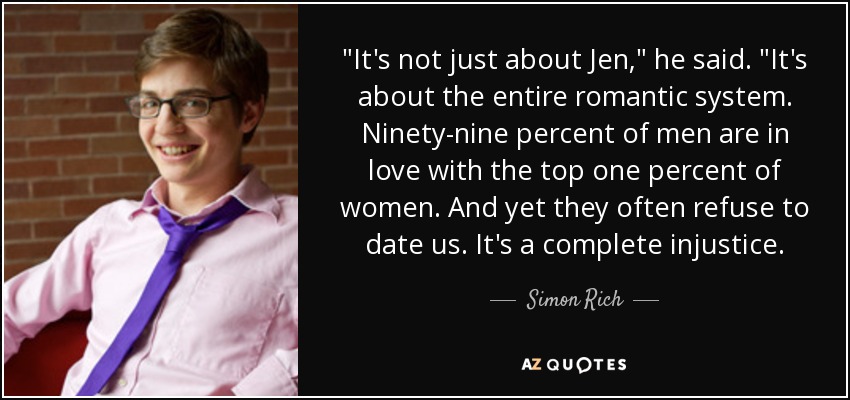 "It's not just about Jen," he said. "It's about the entire romantic system. Ninety-nine percent of men are in love with the top one percent of women. And yet they often refuse to date us. It's a complete injustice.