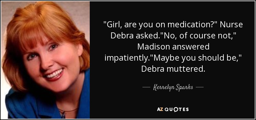 "Girl, are you on medication?" Nurse Debra asked."No, of course not," Madison answered impatiently."Maybe you should be," Debra muttered.