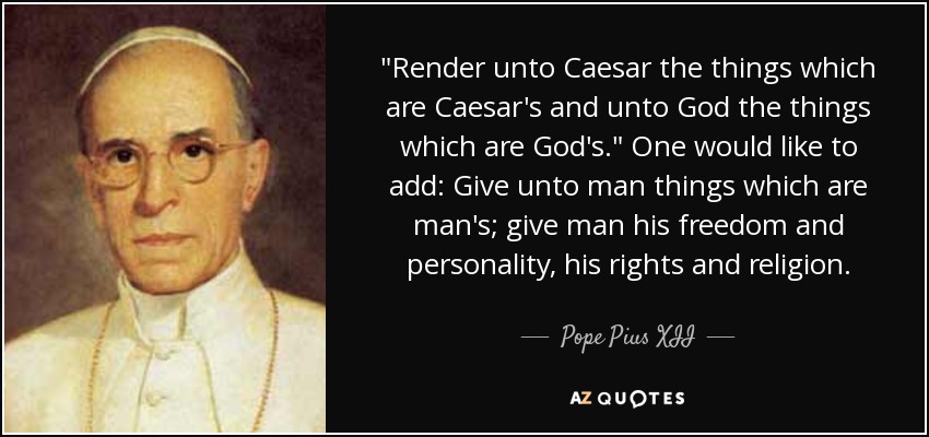 "Render unto Caesar the things which are Caesar's and unto God the things which are God's." One would like to add: Give unto man things which are man's; give man his freedom and personality, his rights and religion.