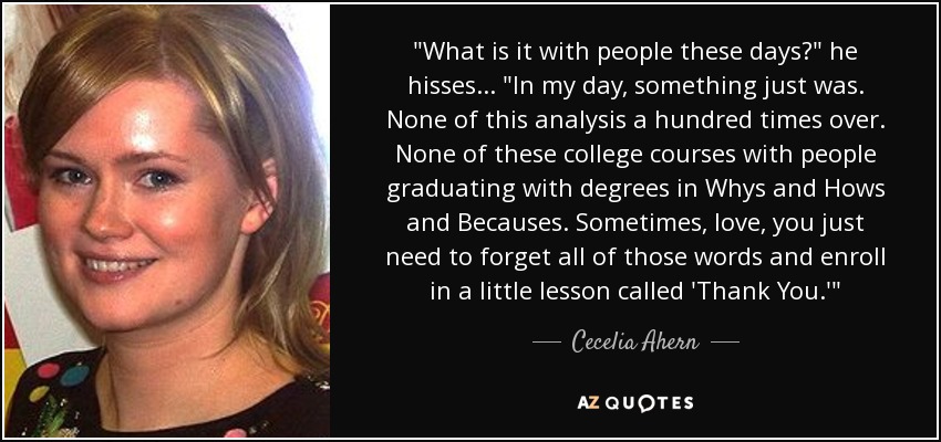 "What is it with people these days?" he hisses... "In my day, something just was. None of this analysis a hundred times over. None of these college courses with people graduating with degrees in Whys and Hows and Becauses. Sometimes, love, you just need to forget all of those words and enroll in a little lesson called 'Thank You.'"