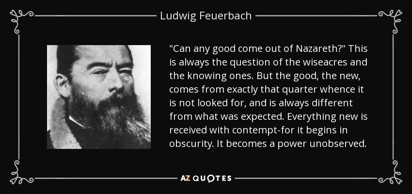 "Can any good come out of Nazareth?" This is always the question of the wiseacres and the knowing ones. But the good, the new, comes from exactly that quarter whence it is not looked for, and is always different from what was expected. Everything new is received with contempt-for it begins in obscurity. It becomes a power unobserved.