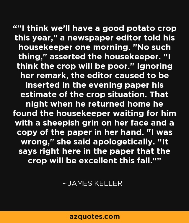 "I think we'll have a good potato crop this year," a newspaper editor told his housekeeper one morning. "No such thing," asserted the housekeeper. "I think the crop will be poor." Ignoring her remark, the editor caused to be inserted in the evening paper his estimate of the crop situation. That night when he returned home he found the housekeeper waiting for him with a sheepish grin on her face and a copy of the paper in her hand. "I was wrong," she said apologetically. "It says right here in the paper that the crop will be excellent this fall."