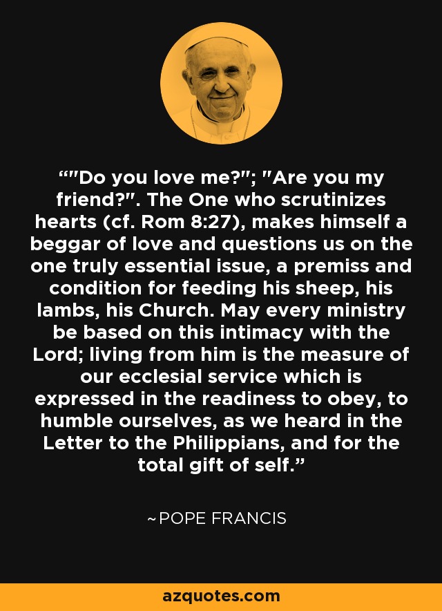 "Do you love me?"; "Are you my friend?". The One who scrutinizes hearts (cf. Rom 8:27), makes himself a beggar of love and questions us on the one truly essential issue, a premiss and condition for feeding his sheep, his lambs, his Church. May every ministry be based on this intimacy with the Lord; living from him is the measure of our ecclesial service which is expressed in the readiness to obey, to humble ourselves, as we heard in the Letter to the Philippians, and for the total gift of self.