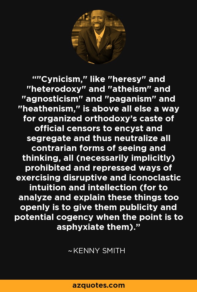 "Cynicism," like "heresy" and "heterodoxy" and "atheism" and "agnosticism" and "paganism" and "heathenism," is above all else a way for organized orthodoxy's caste of official censors to encyst and segregate and thus neutralize all contrarian forms of seeing and thinking, all (necessarily implicitly) prohibited and repressed ways of exercising disruptive and iconoclastic intuition and intellection (for to analyze and explain these things too openly is to give them publicity and potential cogency when the point is to asphyxiate them).