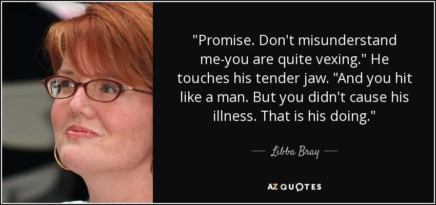 "Promise. Don't misunderstand me-you are quite vexing." He touches his tender jaw. "And you hit like a man. But you didn't cause his illness. That is his doing."
