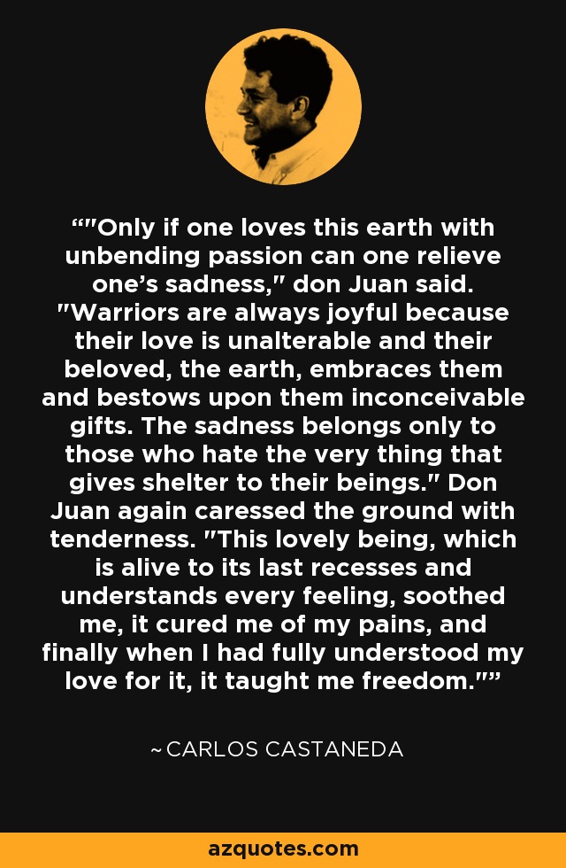 "Only if one loves this earth with unbending passion can one relieve one's sadness," don Juan said. "Warriors are always joyful because their love is unalterable and their beloved, the earth, embraces them and bestows upon them inconceivable gifts. The sadness belongs only to those who hate the very thing that gives shelter to their beings." Don Juan again caressed the ground with tenderness. "This lovely being, which is alive to its last recesses and understands every feeling, soothed me, it cured me of my pains, and finally when I had fully understood my love for it, it taught me freedom."