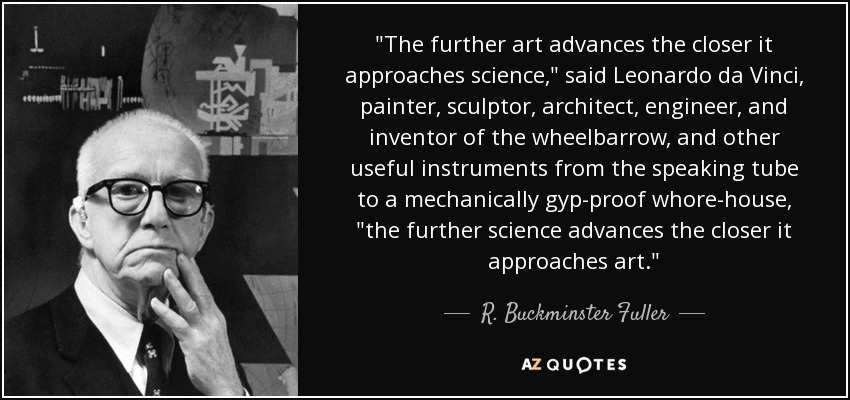 "The further art advances the closer it approaches science," said Leonardo da Vinci, painter, sculptor, architect, engineer, and inventor of the wheelbarrow, and other useful instruments from the speaking tube to a mechanically gyp-proof whore-house, "the further science advances the closer it approaches art."