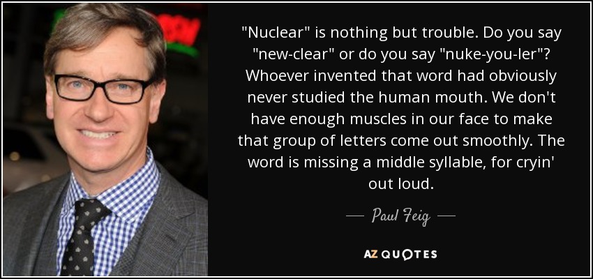 "Nuclear" is nothing but trouble. Do you say "new-clear" or do you say "nuke-you-ler"? Whoever invented that word had obviously never studied the human mouth. We don't have enough muscles in our face to make that group of letters come out smoothly. The word is missing a middle syllable, for cryin' out loud.