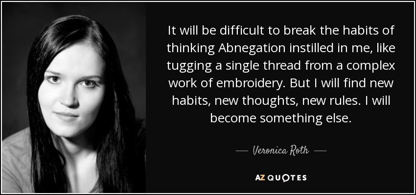 It will be difficult to break the habits of thinking Abnegation instilled in me, like tugging a single thread from a complex work of embroidery. But I will find new habits, new thoughts, new rules. I will become something else.