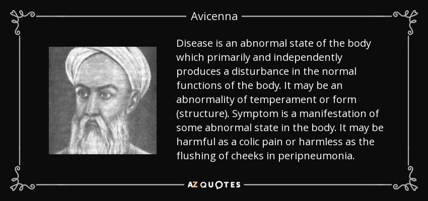 Disease is an abnormal state of the body which primarily and independently produces a disturbance in the normal functions of the body. It may be an abnormality of temperament or form (structure). Symptom is a manifestation of some abnormal state in the body. It may be harmful as a colic pain or harmless as the flushing of cheeks in peripneumonia.