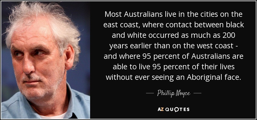 Most Australians live in the cities on the east coast, where contact between black and white occurred as much as 200 years earlier than on the west coast - and where 95 percent of Australians are able to live 95 percent of their lives without ever seeing an Aboriginal face.