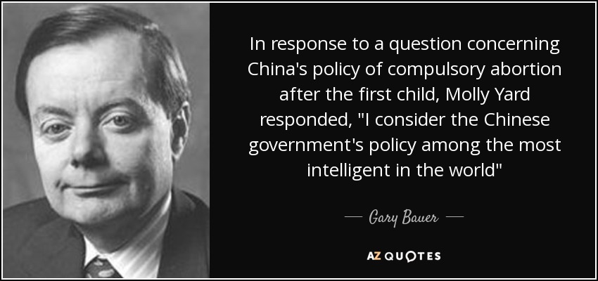 In response to a question concerning China's policy of compulsory abortion after the first child, Molly Yard responded, "I consider the Chinese government's policy among the most intelligent in the world"