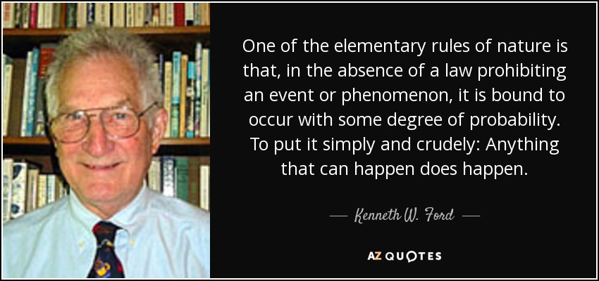 One of the elementary rules of nature is that, in the absence of a law prohibiting an event or phenomenon, it is bound to occur with some degree of probability. To put it simply and crudely: Anything that can happen does happen.