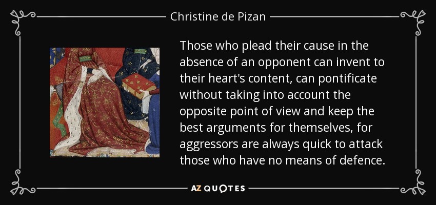 Those who plead their cause in the absence of an opponent can invent to their heart's content, can pontificate without taking into account the opposite point of view and keep the best arguments for themselves, for aggressors are always quick to attack those who have no means of defence.