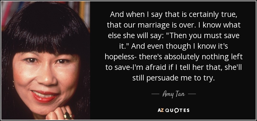 And when I say that is certainly true, that our marriage is over. I know what else she will say: "Then you must save it." And even though I know it's hopeless- there's absolutely nothing left to save-I'm afraid if I tell her that, she'll still persuade me to try.