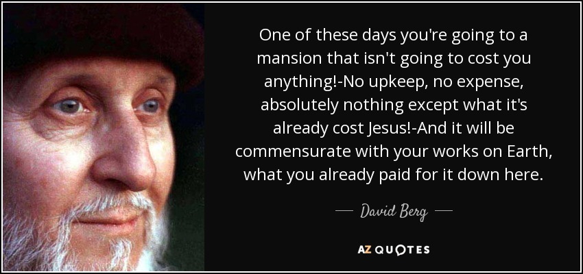 One of these days you're going to a mansion that isn't going to cost you anything!-No upkeep, no expense, absolutely nothing except what it's already cost Jesus!-And it will be commensurate with your works on Earth, what you already paid for it down here.
