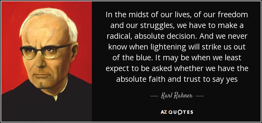 In the midst of our lives, of our freedom and our struggles, we have to make a radical, absolute decision. And we never know when lightening will strike us out of the blue. It may be when we least expect to be asked whether we have the absolute faith and trust to say yes