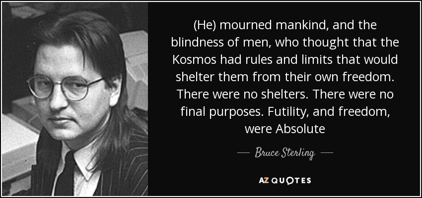 (He) mourned mankind, and the blindness of men, who thought that the Kosmos had rules and limits that would shelter them from their own freedom. There were no shelters. There were no final purposes. Futility, and freedom, were Absolute