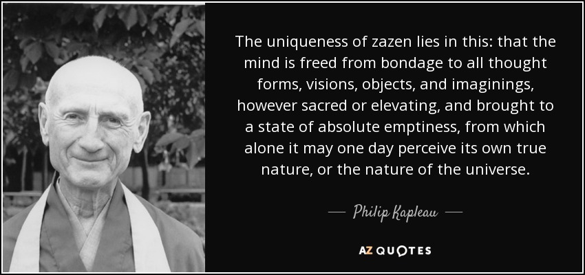 The uniqueness of zazen lies in this: that the mind is freed from bondage to all thought forms, visions, objects, and imaginings, however sacred or elevating, and brought to a state of absolute emptiness, from which alone it may one day perceive its own true nature, or the nature of the universe.