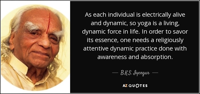 As each individual is electrically alive and dynamic, so yoga is a living, dynamic force in life. In order to savor its essence, one needs a religiously attentive dynamic practice done with awareness and absorption.