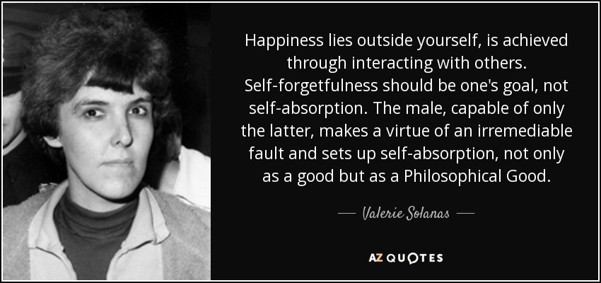 Happiness lies outside yourself, is achieved through interacting with others. Self-forgetfulness should be one's goal, not self-absorption. The male, capable of only the latter, makes a virtue of an irremediable fault and sets up self-absorption, not only as a good but as a Philosophical Good.